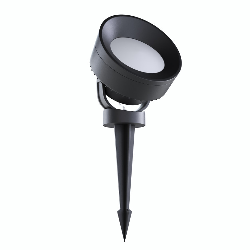 LED-staak met spike gemaakt van schok-, corrosie- en UV-bestendig hars. De staak heeft een vizier aan de voorkant dat verblinding tegengaat en het licht richt. Hij wordt geïnstalleerd door hem in de grond, het gras of het zand te slaan.