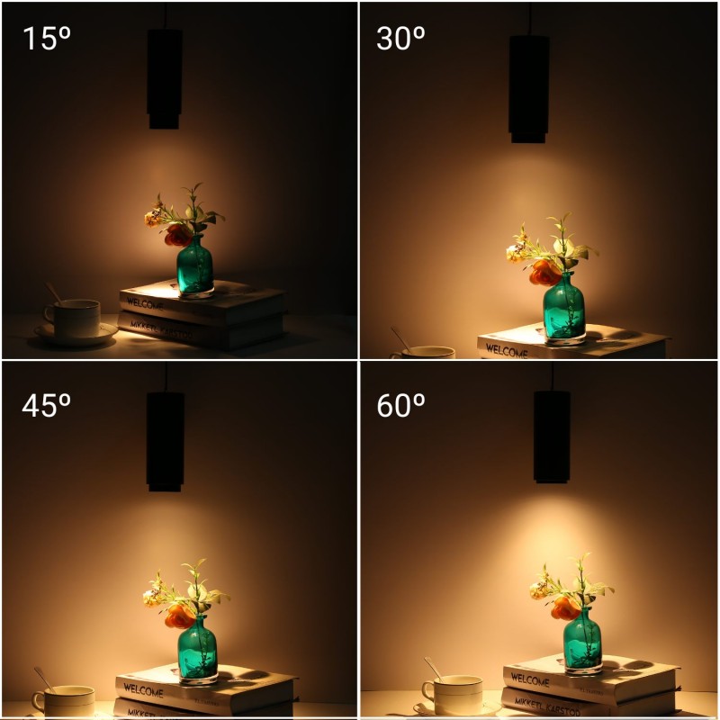 Hij straalt een warm licht uit (2700K) en de openingshoek van het licht kan worden aangepast van 15° tot 60° door aan de lens te draaien.