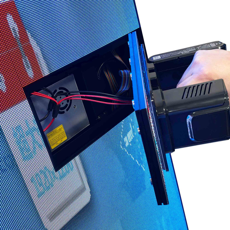 Het moderne en elegante ontwerp, met een stevige metalen structuur, integreert 14 pitch 2,5 LED modules met onderhoud aan de voorkant, wat zorgt voor een uitstekende beeldkwaliteit en eenvoudig onderhoud (onderhoudsgereedschap niet inbegrepen).