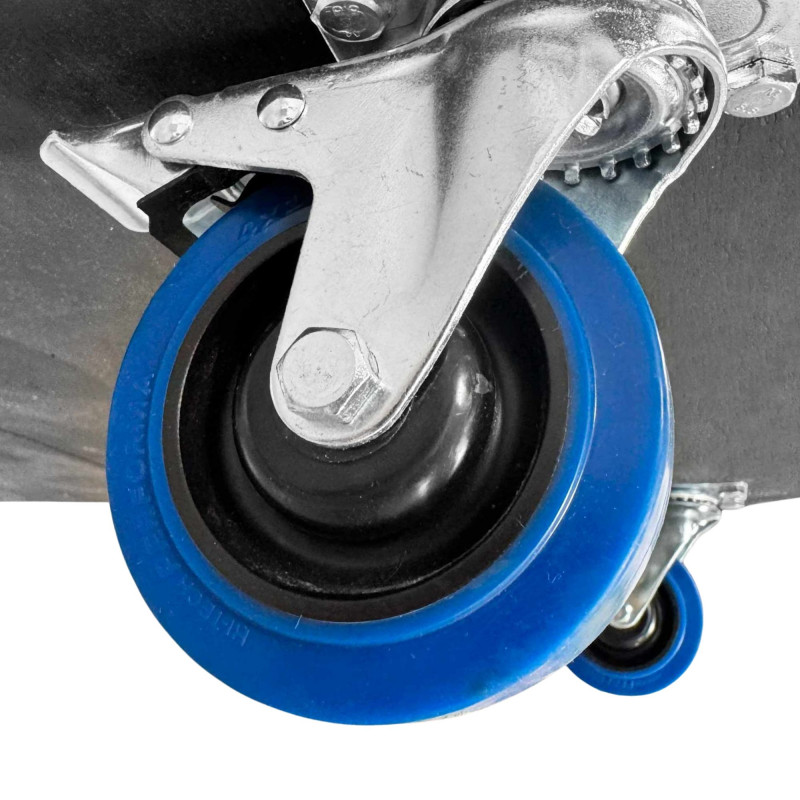 - Vier zwenkwielen voor zwaar gebruik: Zwenkwielen met rem, voor een soepele en gecontroleerde verplaatsing door gangpaden en vloeren van evenementen.