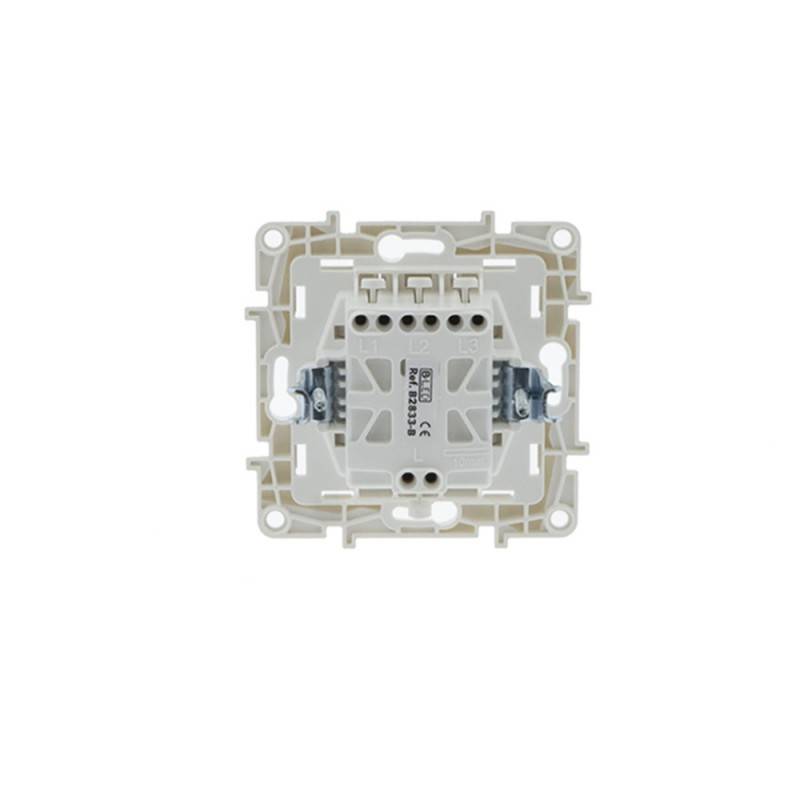 Driedelig schakelmechanisme (stuurt drie onafhankelijke circuits aan), niet geschakeld. De driedelige schakelaar is ontworpen voor inbouw in een universele doos. De draden worden bevestigd met schroefloze snelklemmen.