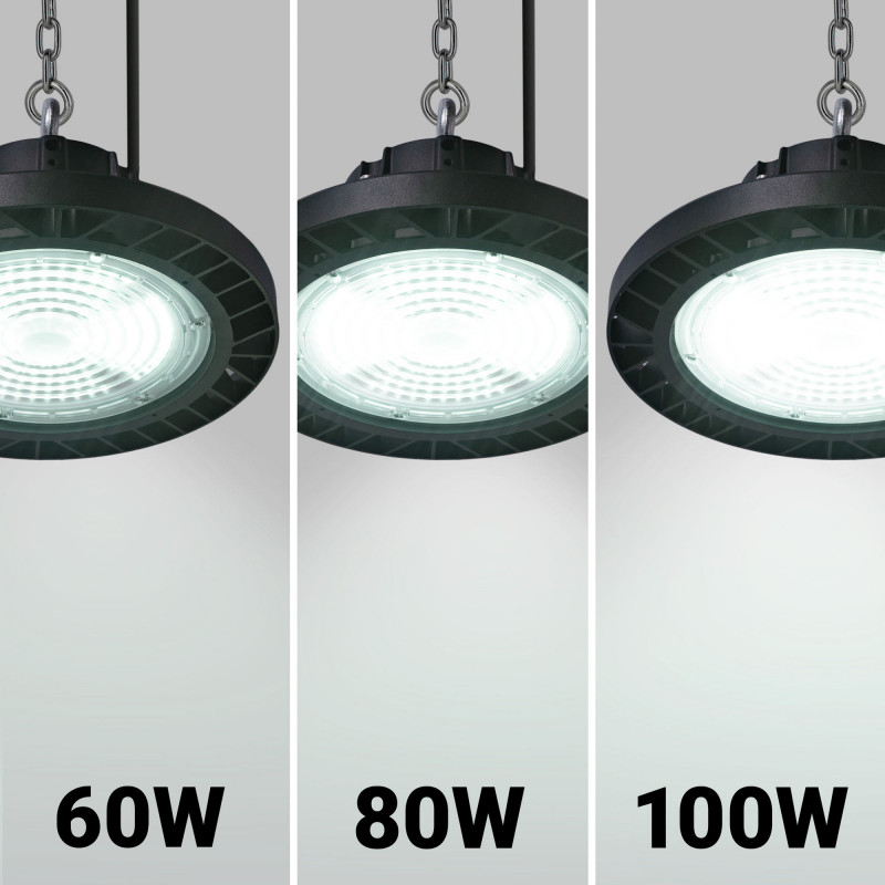 Możliwość regulacji mocy (60 W, 80 W, 100 W) za pomocą przełącznika DIP Switch umożliwia dostosowanie światła do konkretnych potrzeb przestrzeni, optymalizując zużycie energii bez uszczerbku dla jakości światła.