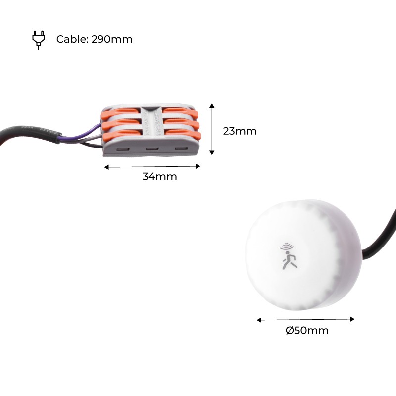 Czujnik ruchu działa przy napięciu 10-15 V DC i ma 3 tryby przełączania. Aktywuje się, wyłącza lub przechodzi w tryb "Standby" przy ruchach i ruchach w jego zakresie działania. W ten sposób można zaoszczędzić zużycie energii i być bardziej zrównoważonym . Posiada stopień ochrony IP65, idealny do użytku na zewnątrz i wewnątrz pomieszczeń narażonych na wilgoć i wysokie temperatury. Zawiera również szybkozłącze dla łatwej i wygodnej instalacji.