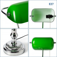Dostępna w różnych kombinacjach, z zielonym lub białym abażurem i podstawą z mosiądzu, chromu lub niklu.