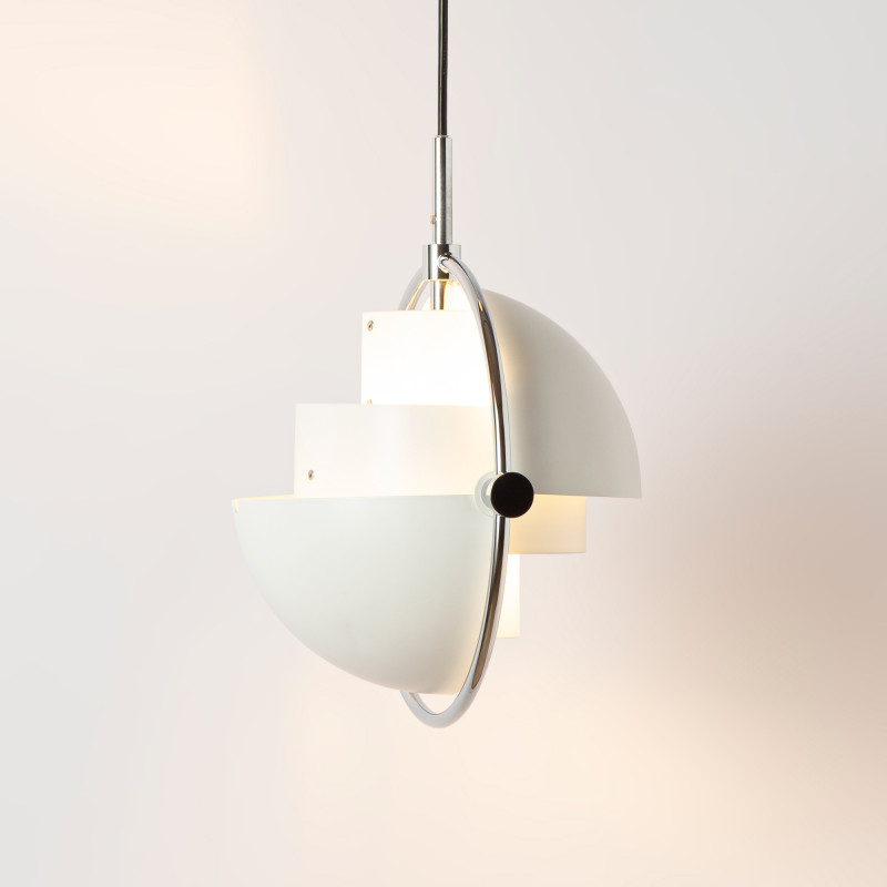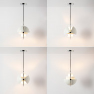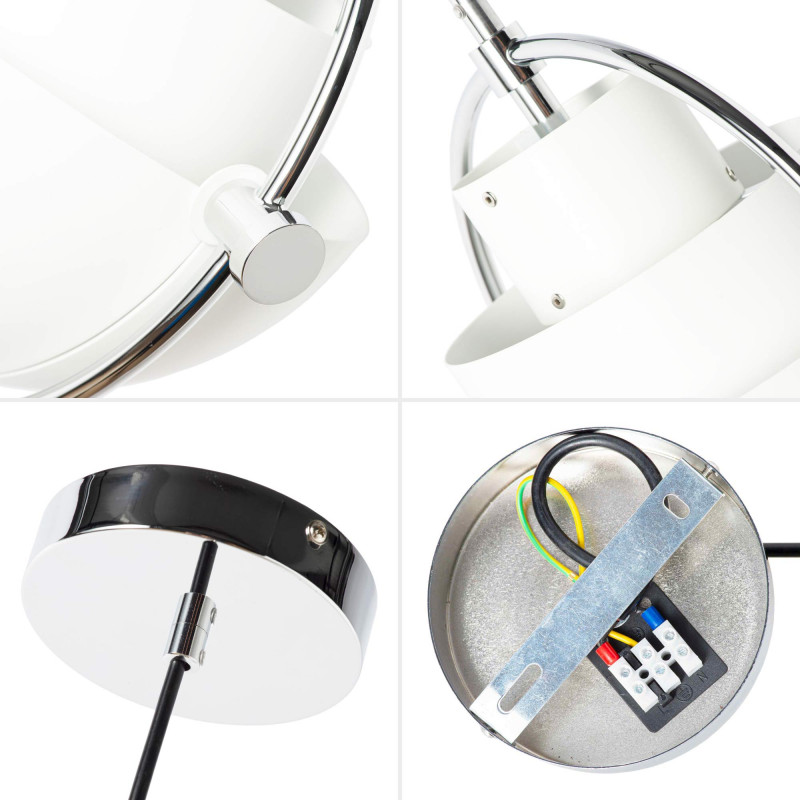 - Unikalny design: Dwa półkuliste klosze wsparte na metalowym pierścieniu umożliwiają skierowanie światła w górę, w dół lub pod niestandardowym kątem, tworząc dekoracyjny asymetryczny efekt.