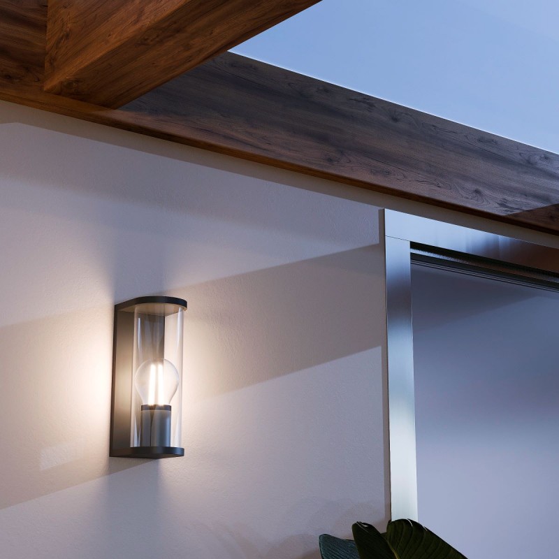 Zewnętrzna lampa ścienna "MARISA" łączyaluminiowy korpus w matowym czarnym wykończeniu z cylindrycznym przezroczystym szklanym dyfuzorem, którego design dodaje estetyki każdej przestrzeni.