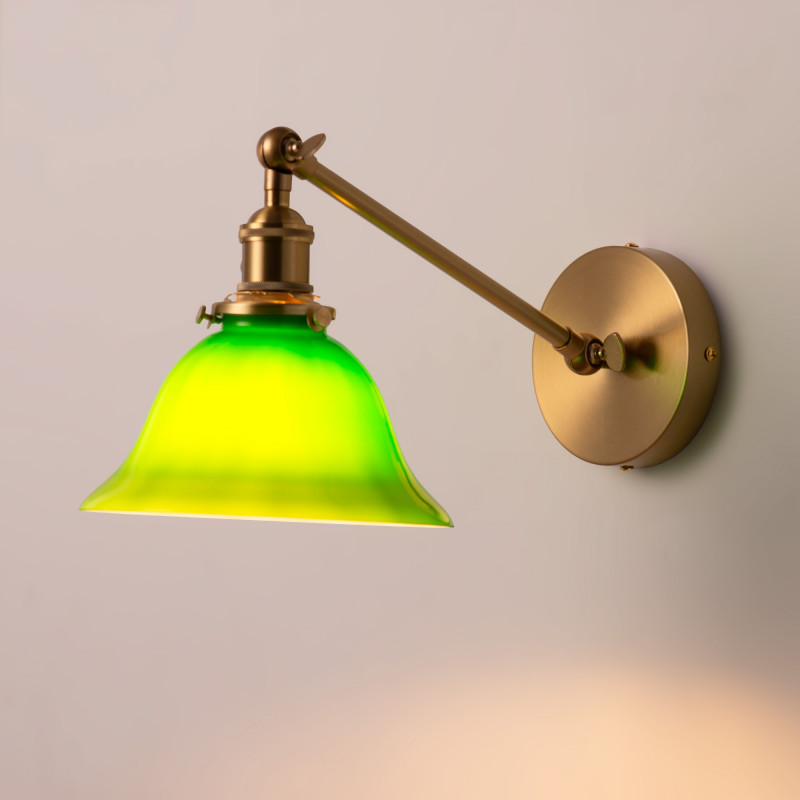 Ta lampa ścienna łączy w sobie regulowaną konstrukcję z wysokiej jakości materiałami. Jego wyrafinowane wykończenie i zielony szklany klosz dodają charakterystycznego i wyrafinowanego akcentu do każdej przestrzeni.