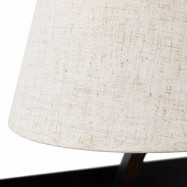 Posiada lakierowaną na biało aluminiową podstawę, elegancki beżowy klosz z tkaniny i półkę w kolorze naturalnego drewna.