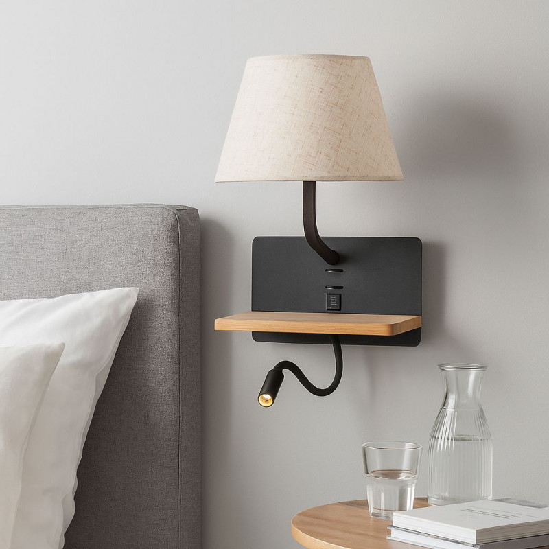 Kinkiet jest wyposażony w port USB i port USB-C, z drewnianą podstawą do podparcia telefonu komórkowego, umożliwiając praktyczne ładowanie w nocy.