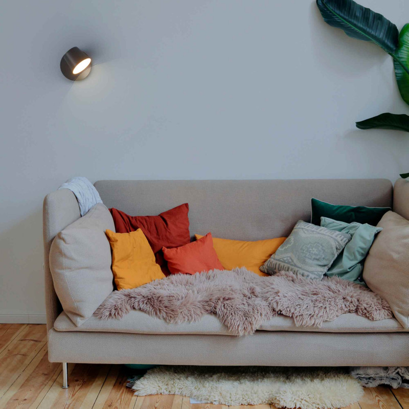 Prosta i elegancka wewnętrzna lampa ścienna z obrotową głowicą do kierowania wiązki światła. Otwarty układ optyczny 120º umożliwia szerokie oświetlenie: