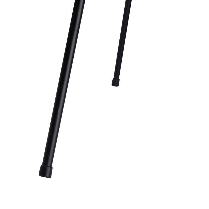 Ta lampa podłogowa ma solidną czarną metalową konstrukcję w kształcie statywu, która zapobiega przewróceniu się i uszkodzeniu powierzchni.