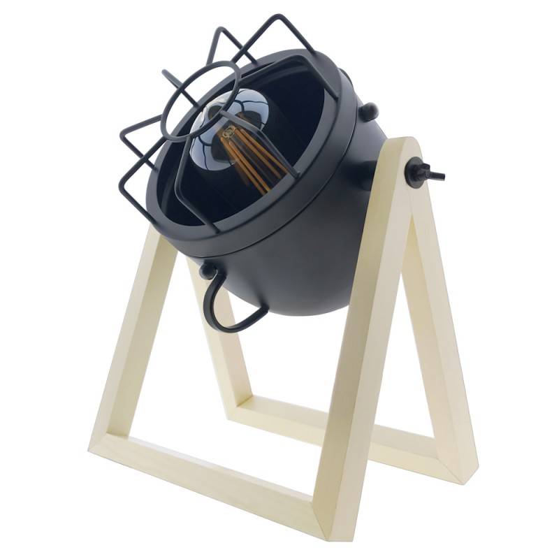 Lampa stołowa w industrialnym stylu vintage ze składaną drewnianą podstawą i metalową odchylaną głowicą z klatką, lakierowaną na czarno. Z gniazdem na żarówki E27. Lampa stołowa zawiera dekoracyjny czerwony kabel tekstylny o długości 1,5 m z europejską wtyczką.