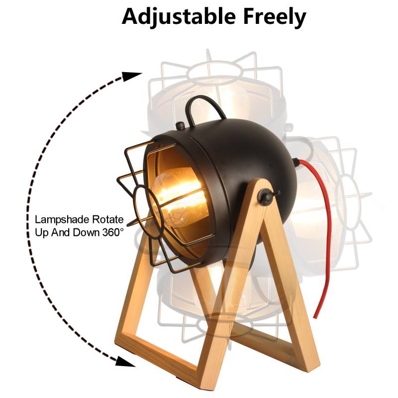 Lampa stołowa w stylu vintage, design z połowy wieku, z regulowaną podstawą. Włącznik/wyłącznik. Styl retro dodadzą tej lampie żarówki LED. Dekoracja do każdego rodzaju otoczenia, z kątem obrotu 360 stopni. Połączenie drewnianej podstawy z czarnym, matowym, lakierowanym metalowym kloszem nadaje tej lampie stołowej oryginalny i niepowtarzalny charakter.