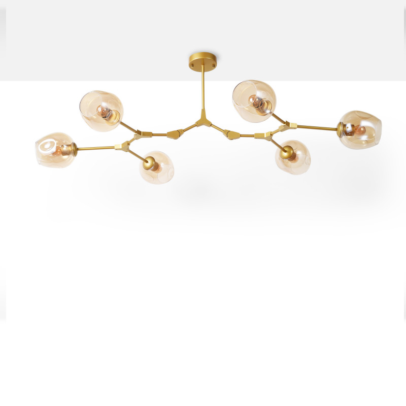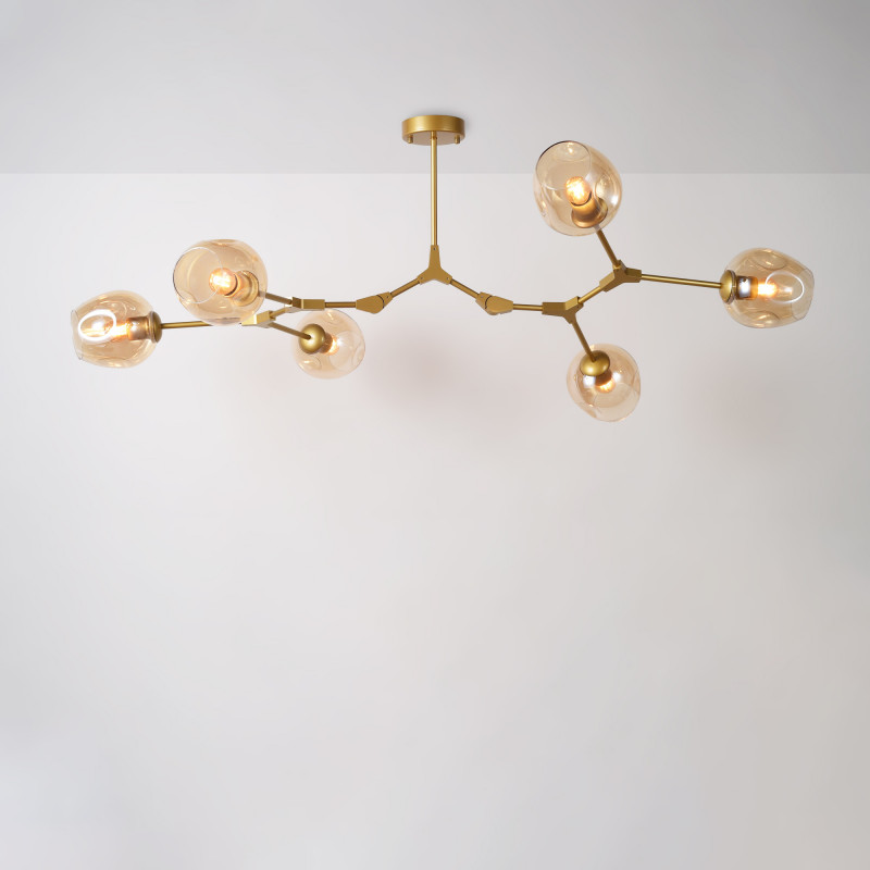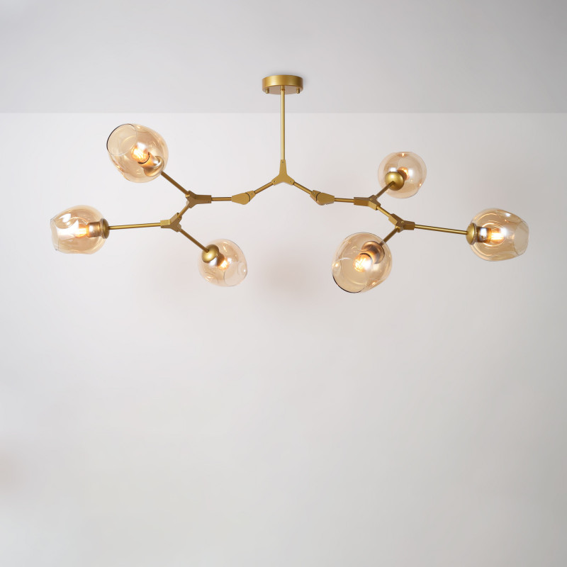 Ta lampa wisząca wyróżnia się nowoczesnym i geometrycznym designem, idealnym dla osób poszukujących dekoracyjnego oświetlenia z charakterem. Jej przegubowa metalowa konstrukcja i sześć szklanych kloszy wprowadzą wyrafinowanie do każdego pomieszczenia, od salonów i jadalni po miejsca pracy lub pomieszczenia komercyjne.