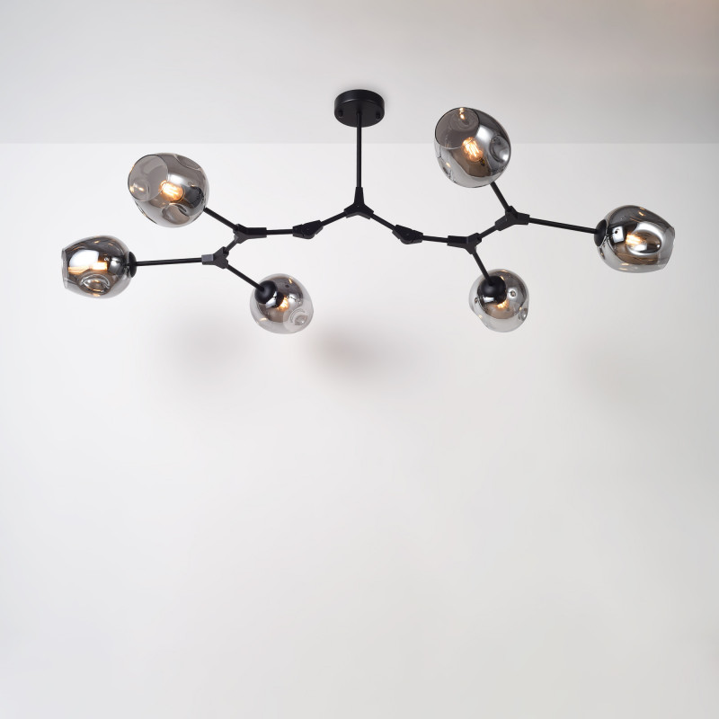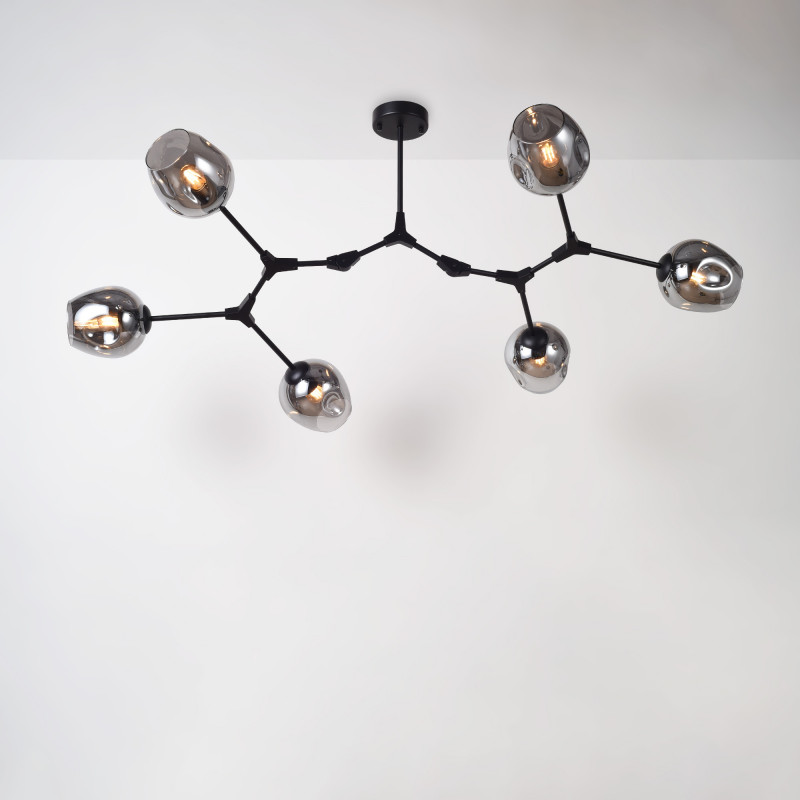 Ta lampa wisząca wyróżnia się nowoczesnym i geometrycznym designem, idealnym dla osób poszukujących dekoracyjnego oświetlenia z charakterem. Jej przegubowa metalowa konstrukcja i sześć szklanych kloszy wprowadzą wyrafinowanie do każdego pomieszczenia, od salonów i jadalni po miejsca pracy lub pomieszczenia komercyjne.