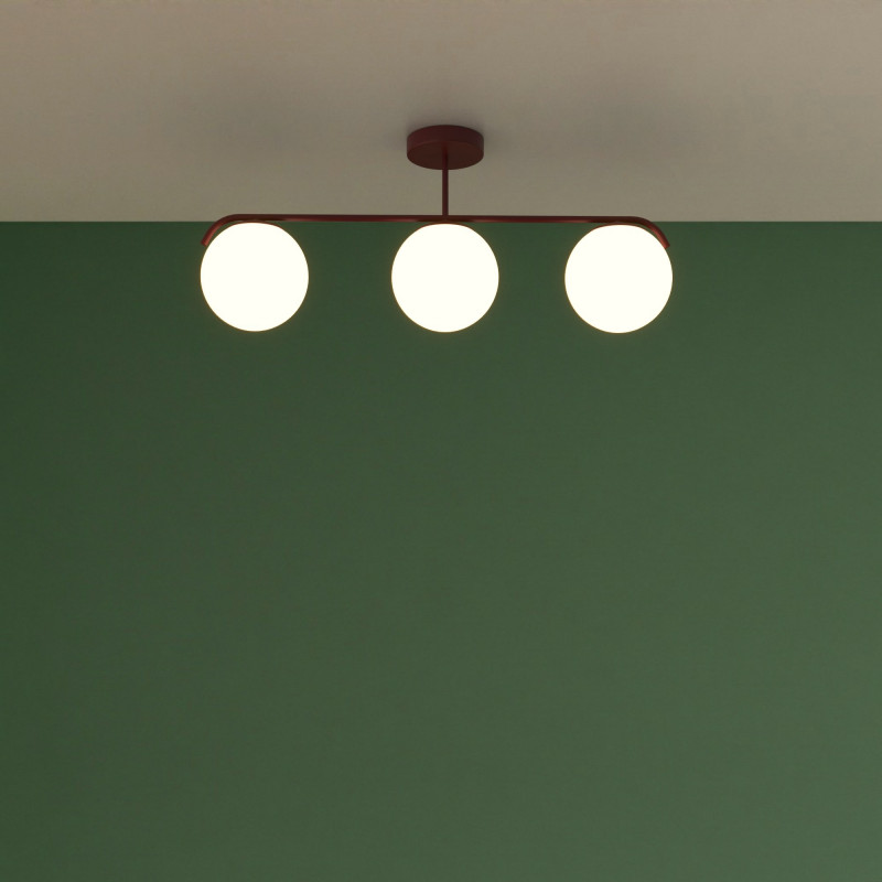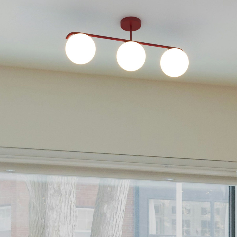 Lampa sufitowa "Talí" posiada metalową konstrukcję połączoną z centralną rozetą i trzema kulistymi kloszami ze szkła opalowego o wysokiej przepuszczalności światła, zdolnymi do zapewnienia jasnego i jednorodnego oświetlenia.