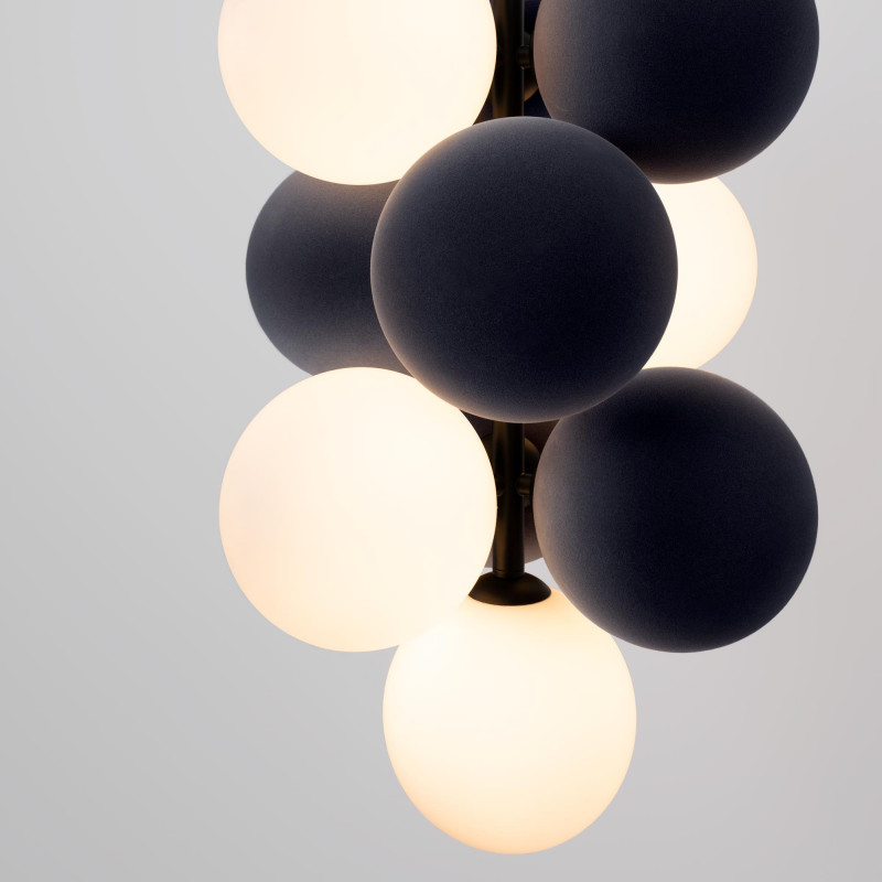 Zainspirowany istotą abstrakcji, ten element prezentuje pionowy projekt, składający się z 10 kul o średnicy 140 mm każda; 4 świecące kule (żarówki G9) z opalowego szkła i 6 absorberów pokrytych akustyczną osłoną tekstylną, dostępnąw kolorze szarym lub brązowym .