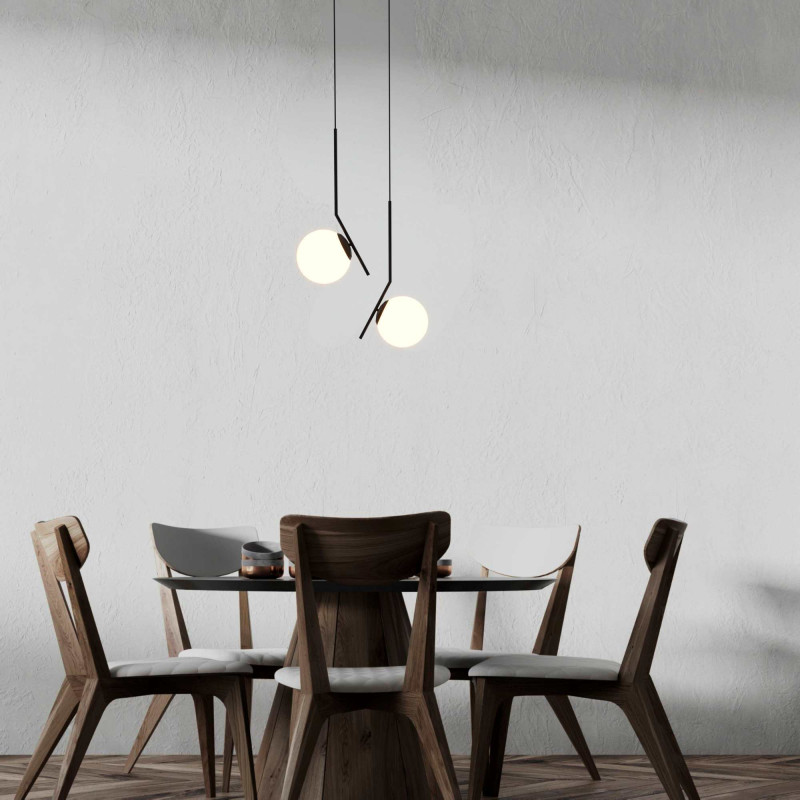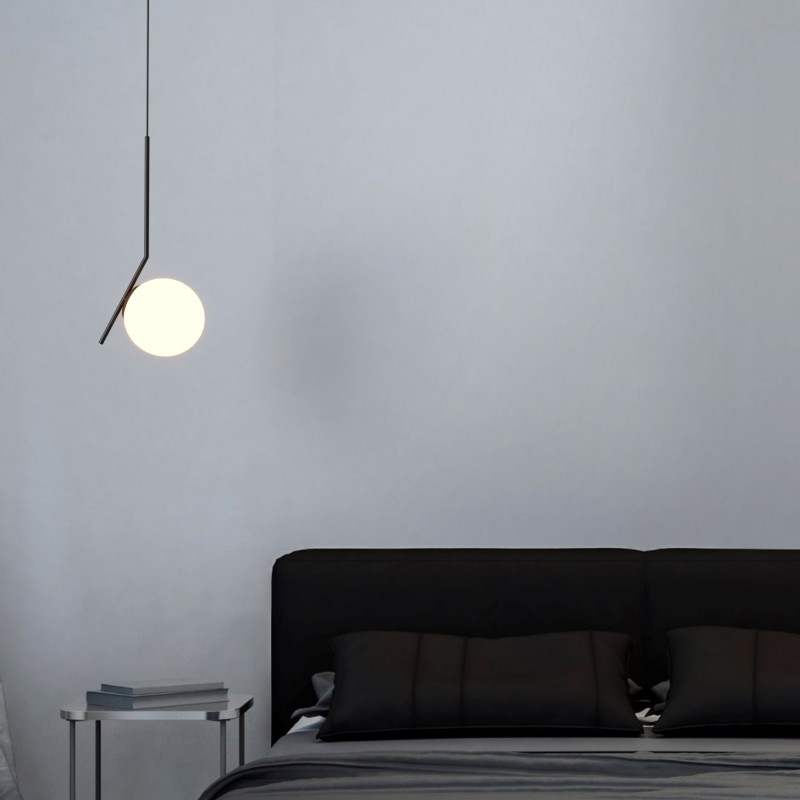 Lampa wisząca "HERMI" składa się z kuli z opalowego szkła i aluminiowej struktury.