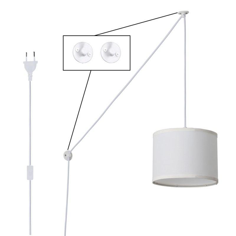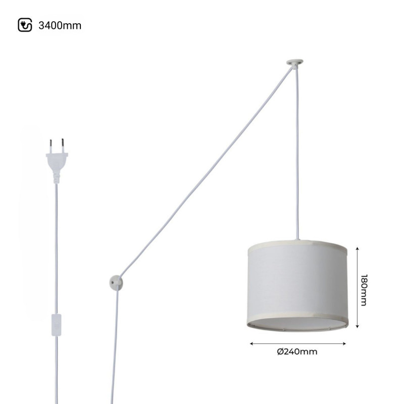 Stylowe wiszące lampy sufitowe z kloszem z tkaniny, kołem pasowym, przełącznikiem i wtyczką. Koło pasowe z wtyczką i przełącznikiem umożliwia regulację wysokości lampy do maksymalnej długości 2,40 m oraz szybki i łatwy montaż.