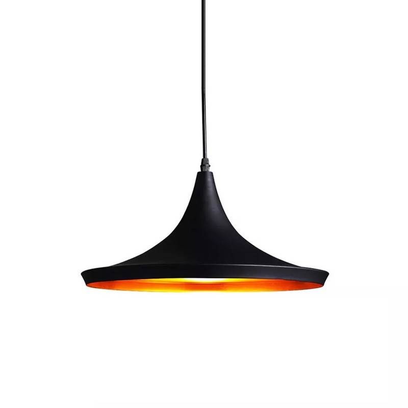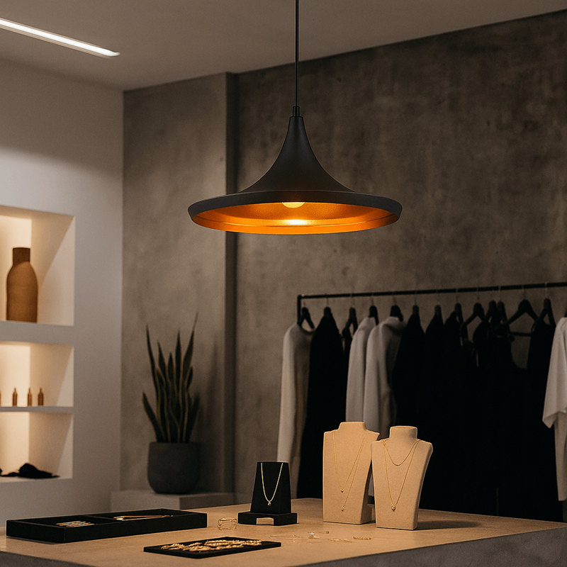 Posiada aluminiowy klosz o matowym wykończeniu, dostępny w kolorze czarnym lub białym, ze złotym wnętrzem.