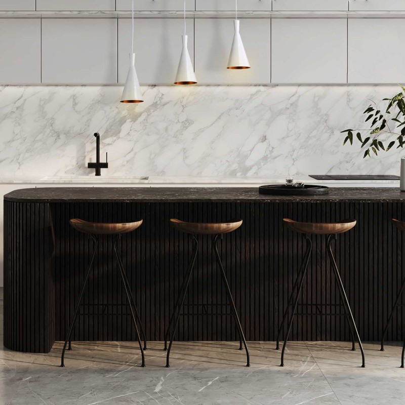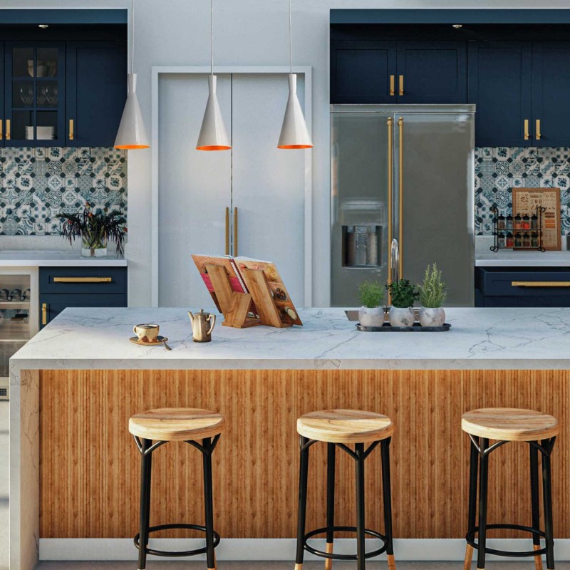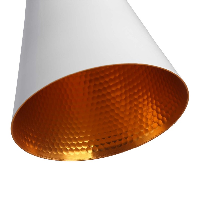 Posiada trzy smukłe lampy wiszące, których wysokość można regulować za pomocą kabli, umożliwiając regulację oświetlenia w zależności od potrzeb każdego użytkownika.