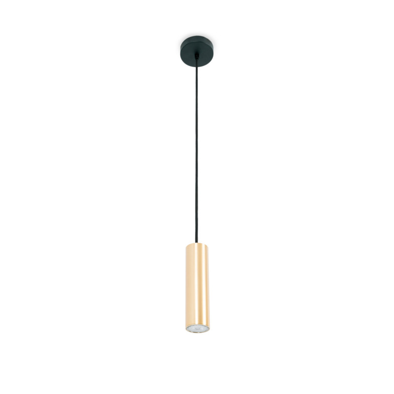 Rurowalampa wisząca o nowoczesnym designie, wykonana z aluminium, dostępna w kolorze czarnym i mosiężnym.