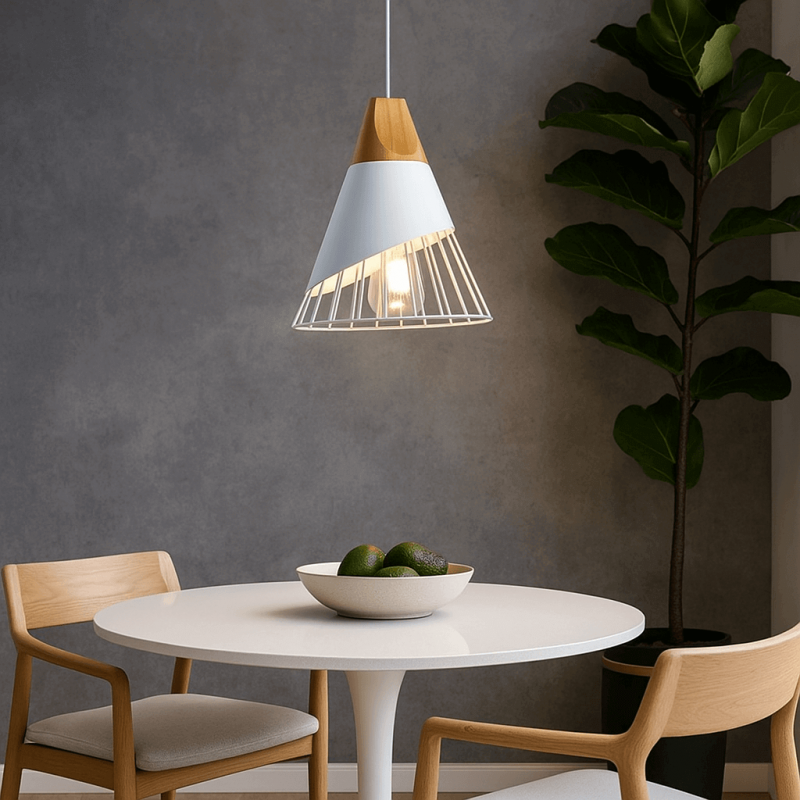 Metalowo-żelazna struktura tej lampy harmonijnie integruje się z detalami z naturalnego drewna, zapewniając wyjątkową równowagę wizualną, która łączy w sobie nowoczesność i ciepło.