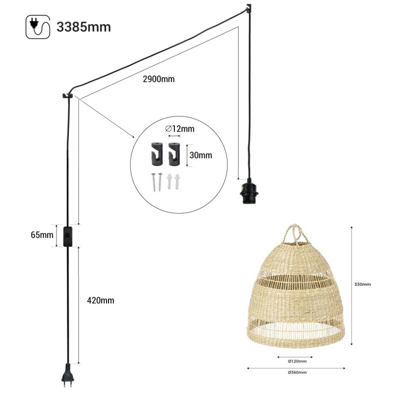 Pasuje do każdej żarówki E27 o mocy do 60W (brak w zestawie) i ma 3 kolory kabla, w zależności od środowiska, z którym chcesz go połączyć (biały, czarny i naturalny sznur).
