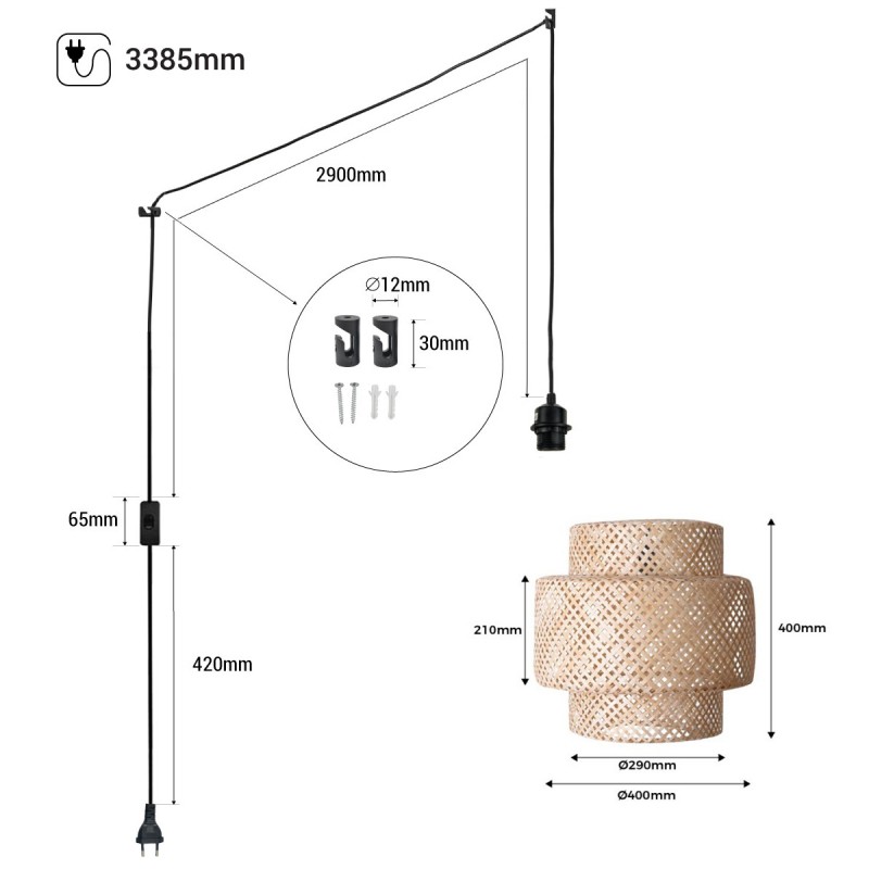 Pasuje do każdej żarówki E27 o mocy do 60W (brak w zestawie) i ma 3 kolory kabla, w zależności od środowiska, z którym chcesz go połączyć (biały, czarny i naturalny sznur).