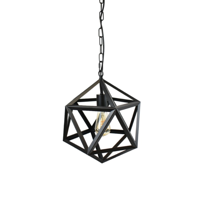 Lampa wisząca w geometrycznym stylu, bardzo dekoracyjna i efektowna wizualnie. Doskonale nadaje się do montażu w barach, kawiarniach i restauracjach. Wykonana z metalu i lakierowana na czarno. Posiada gniazdo na żarówkę E27. Żarówka nie wchodzi w skład zestawu.