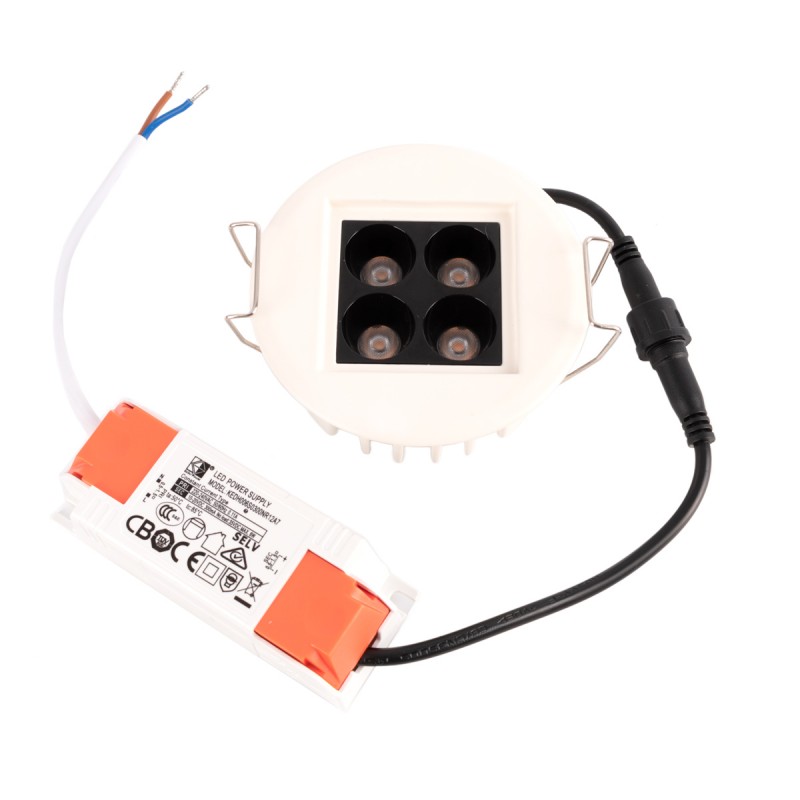 Downlight LED z 4 punktami świetlnymi, idealny do tworzenia nowoczesnego, wysokiej jakości oświetlenia dzięki niskiemu współczynnikowi olśnienia(UGR <18). Posiada chipy OSRAM o wysokim współczynniku oddawania barw(CRI >90), które sprawią, że Twój dom będzie mienił się kolorami i materiałami. Idealny do oświetlenia domu, restauracji, sklepów, hoteli itp. Sterownik jest oddzielony od produktu, co zapewnia lepsze użytkowanie i konserwację produktu.