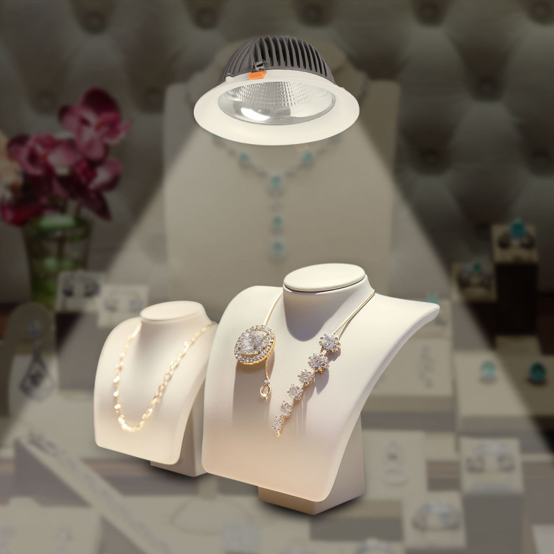 Ten downlight LED o mocy 40 W został zaprojektowany specjalnie z myślą o sklepach jubilerskich i luksusowych przestrzeniach. Wyposażony w specjalny chip R00VA19 i współczynnik oddawania barw CRI >90, zapewnia wysokiej jakości światło, które podkreśla srebrne odcienie biżuterii, sprawiając, że wygląda ona jaśniej i atrakcyjniej dla klientów.