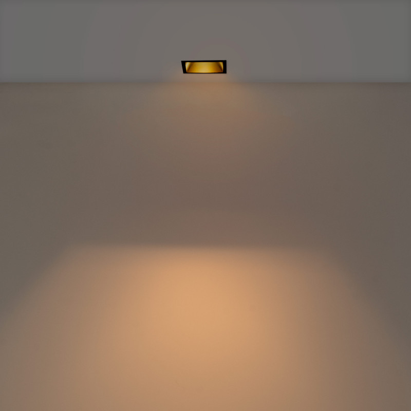 Kwadratowa oprawa wpuszczana typu downlight z asymetrycznym podświetleniem.
