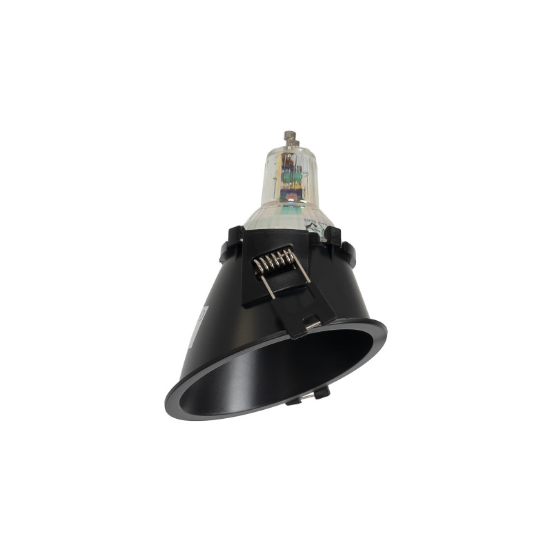 Aro downlight redondo empotrable inclinado con iluminación asimétrica.