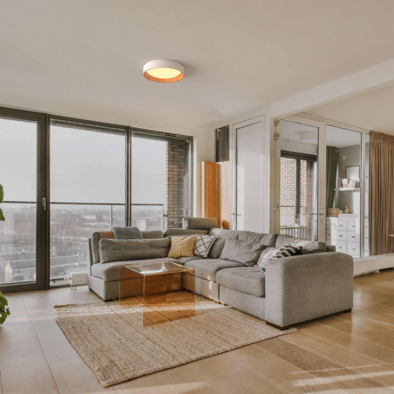 Ta lampa sufitowa LED łączy w sobie białą strukturę z poliwęglanu z wnętrzem w kolorze drewna, dodając odrobinę ciepła i nowoczesności do każdej przestrzeni.