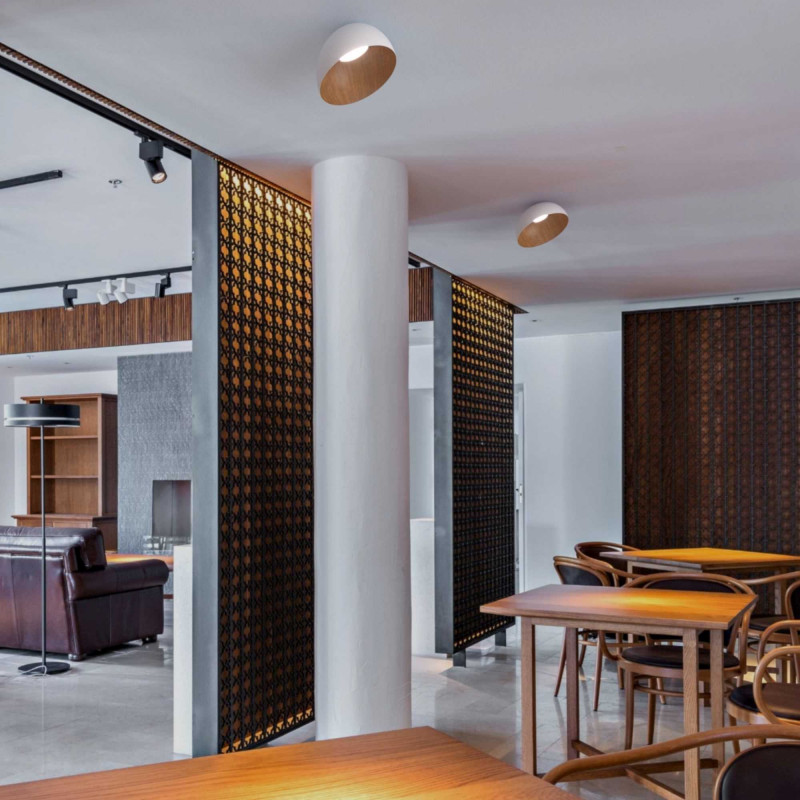 Wszechstronny styl, który dostosowuje się do każdego otoczenia, podkreślając kontrasty w harmonijny sposób dzięki metalowej konstrukcji, wnętrzu z efektem drewna i dyfuzorowi z poliwęglanu zapewniającemu równomierne i wydajne oświetlenie.