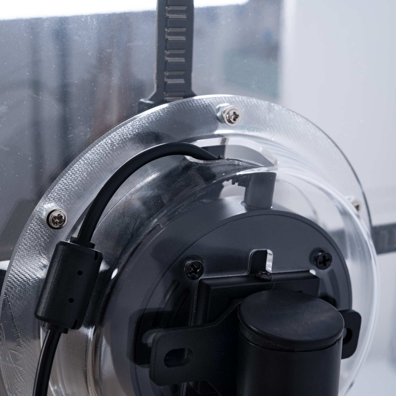 Wentylator posiada zewnętrzny zasilacz z wyjściem 24V. Jego kabel ma długość 2900 mm i jest podłączany bezpośrednio do sieci elektrycznej. Łączy się przez WIFI z dowolnym smartfonem lub komputerem, z którego można łatwo odtwarzać obrazy lub filmy za pomocą aplikacji Spin Display.