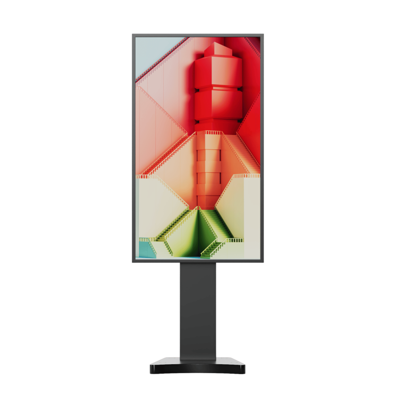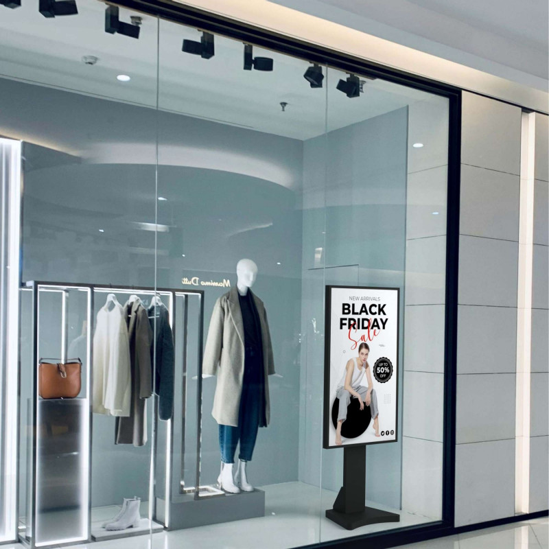 To innowacyjne urządzenie reklamowe ma elegancki wygląd. Jego konstrukcja obejmuje metalową ramę z 55-calowym ekranem LCD. Jest łatwy w instalacji dzięki stojakowi podłogowemu, zapewniającemu stabilność.