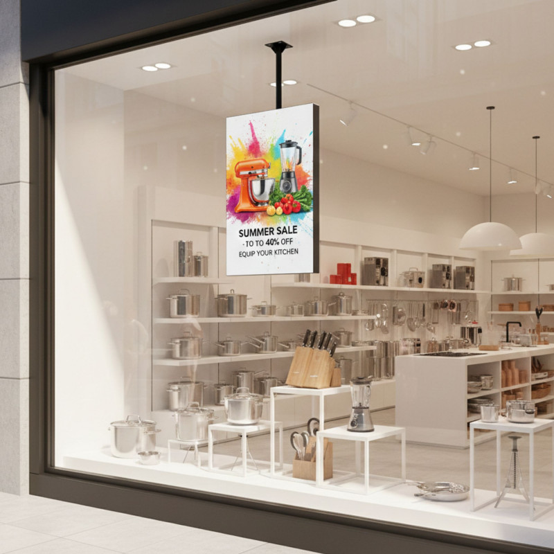 Wyświetlacz jest podwieszany pod sufitem, co zapewnia optymalną widoczność pod różnymi kątami i z dużych odległości, nawet w dużych, uczęszczanych miejscach.