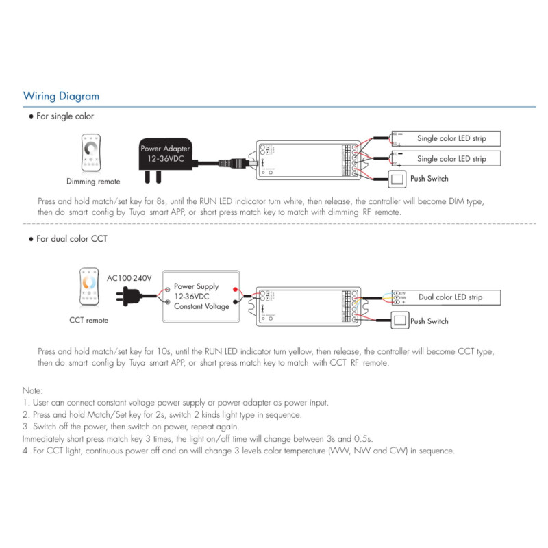 - Sterowanie RF i Push-DIM: Kompatybilny ze sterownikami Skydance RF 2,4 GHz; umożliwia sterowanie strefowe. Obsługuje również zewnętrzny przycisk do włączania/wyłączania, zmiany temperatury (CCT) i ciągłego ściemniania.