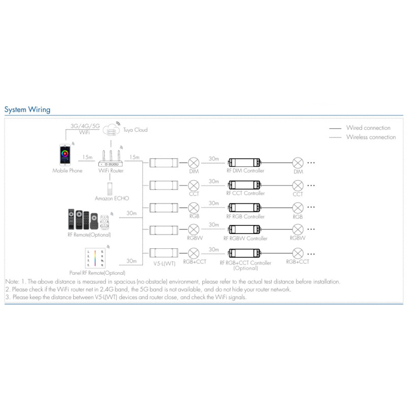 - Szeroka kompatybilność: Obsługuje jednokolorowe taśmy LED 12-48V, CCT, RGB, RGBW i RGB+CCT, z wyjściem 5×6A (12-24V) lub 5×4A (36-48V).