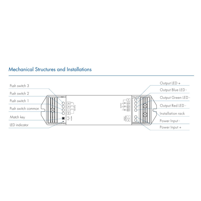 Ten produkt akceptuje do 3 przycisków PUSH i umożliwia różne funkcje, takie jak regulacja według koloru, zmiany odcienia, ściemnianie 0-100% itp.