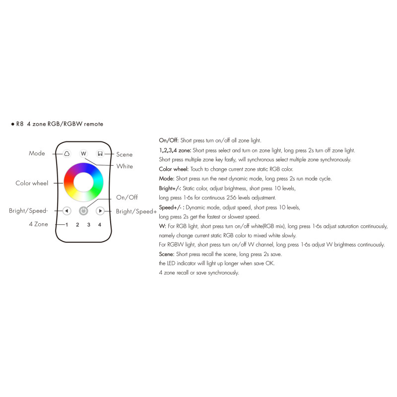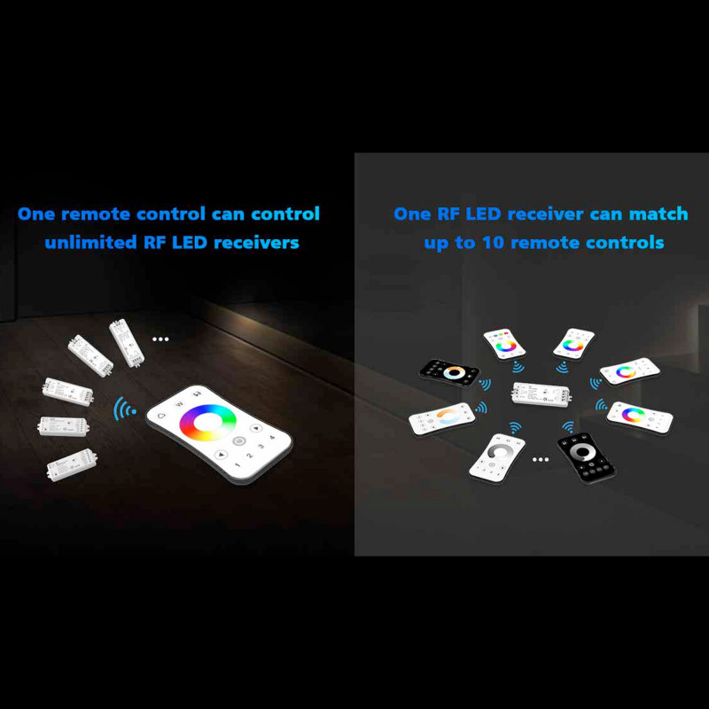 4-strefowy pilot zdalnego sterowania Skydance LED RGB / RGBW oferuje pełną i łatwą kontrolę nad oświetleniem. Nadaje na odległość do 30 metrów, nawet przez ściany i sufity.