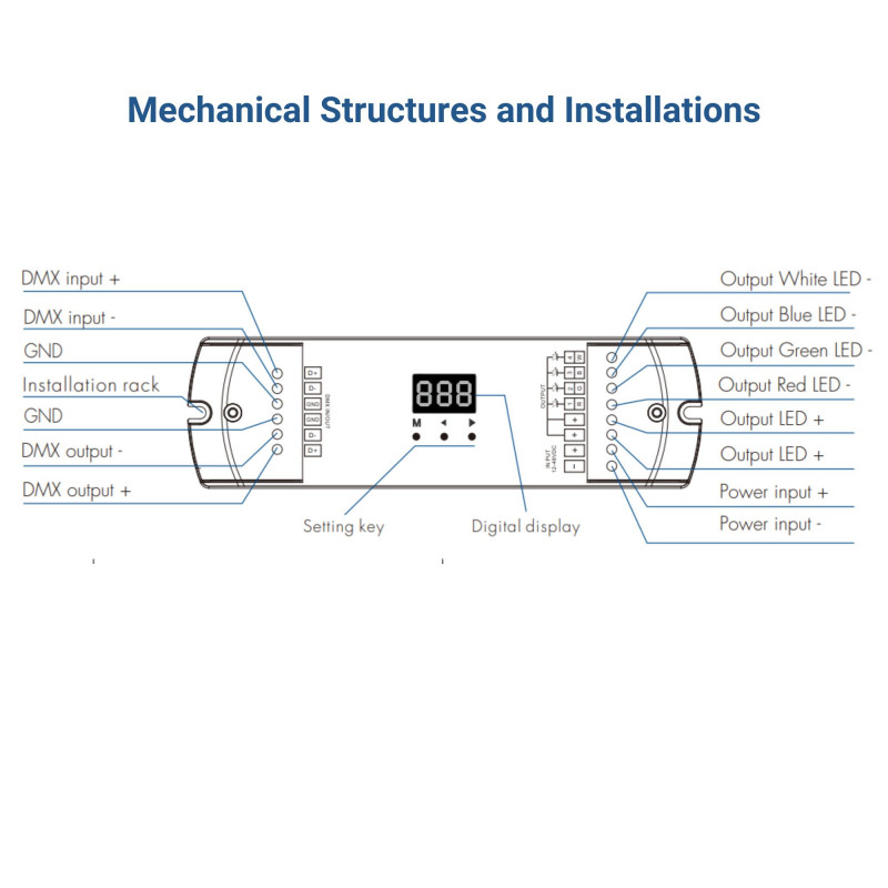 Oferuje tryby dekodowania od 1 do 4 kanałów i różne częstotliwości PWM. Umożliwia wybór między 8-bitowymi lub 16-bitowymi poziomami szarości i dostosowanie krzywej ściemniania. Zawiera samodzielne tryby RGB/RGBW i 4-kanałowe tryby ściemniania, którymi można sterować za pomocą wbudowanych przycisków z zaprogramowanymi programami, umożliwiając działanie bez potrzeby zewnętrznego sygnału DMX.