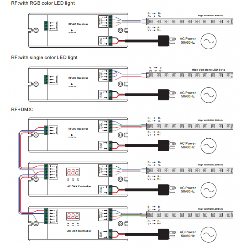 Umożliwia zasilanie taśm LED RGB 230 V prądem do 1,66 A na kanał, przy maksymalnym obciążeniu 1000 W, za pośrednictwem sygnału o częstotliwości radiowej (RF).