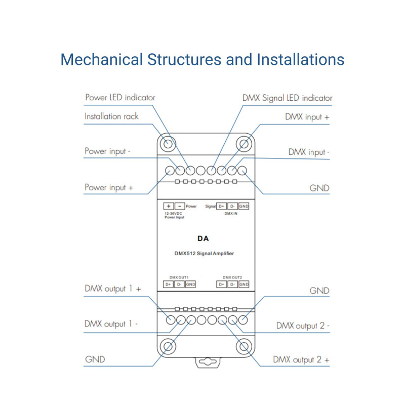 Jest on wyposażony w wejście sygnału DMX512 i podwójne wyjście sygnału DMX512, dzięki czemu sygnał może być rozprowadzany i wzmacniany w dwóch różnych kierunkach. Jest to szczególnie przydatne, gdy trzeba sterować wieloma urządzeniami lub oprawami oświetleniowymi.