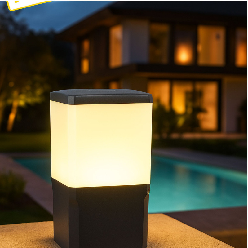 Niewielkich rozmiarów (25 cm) słupek oświetleniowy, nowoczesny design wykonany z odpornej na wstrząsy żywicy, odporny na rdzę, korozję i promienie UV.