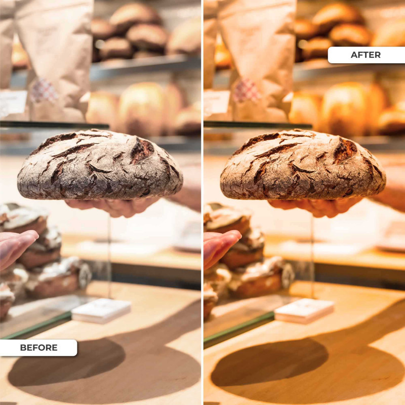 • Piekarnie: Podkreśl złocistobrązowy kolor i teksturę pieczywa i wypieków.