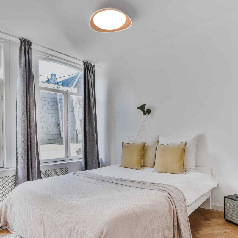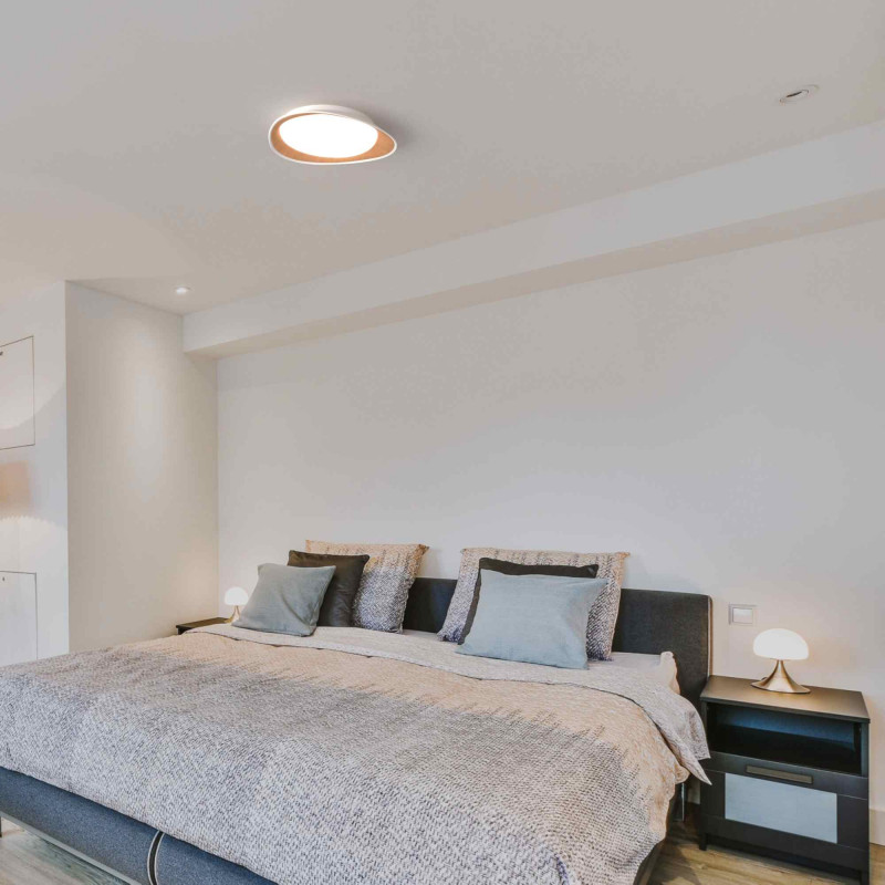 Nuestra lámpara de techo LED presenta un diseño contemporáneo y elegante, combinando una estructura de aluminio en color blanco con un interior en acabado madera.