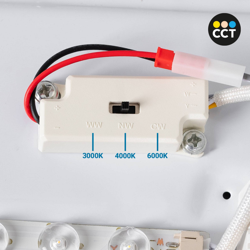 - Tonalidad ajustable: Sistema CCT para ajuste de temperatura de color entre: blanco cálido (3000K), blanco neutro (4000K) y blanco frío (6000K).